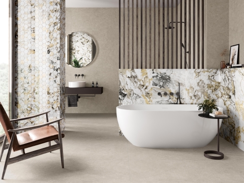 Тонкий керамогранит GROTTA ORO POLISHED LUX 120X260 6 мм от испанской фабрики PAMESA. Выполнен под насыщенный камень, природный мрамор и агат, а полированная поверхность придает ему особую глубину.